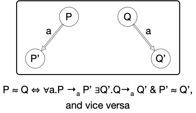 Oh! You’ve never heard of bisimulation? Basically, a computation P is bisimilar to Q just when whatever P can do, Q can do and vice versa; i.e., they can simulate each other. A bisimulation equivalence class can be thought of as a collection of computations that can each simulate each other. To a first approximation, you can think of bisimulation as dividing up computations into an ecosystem. One rosebush can more or less simulate the observable behavior of another, but would be hard pressed to simulate the behavior of an oak tree or a salamander. See the diagram below for a more formal definition. Of course, Wikipedia is your friend!